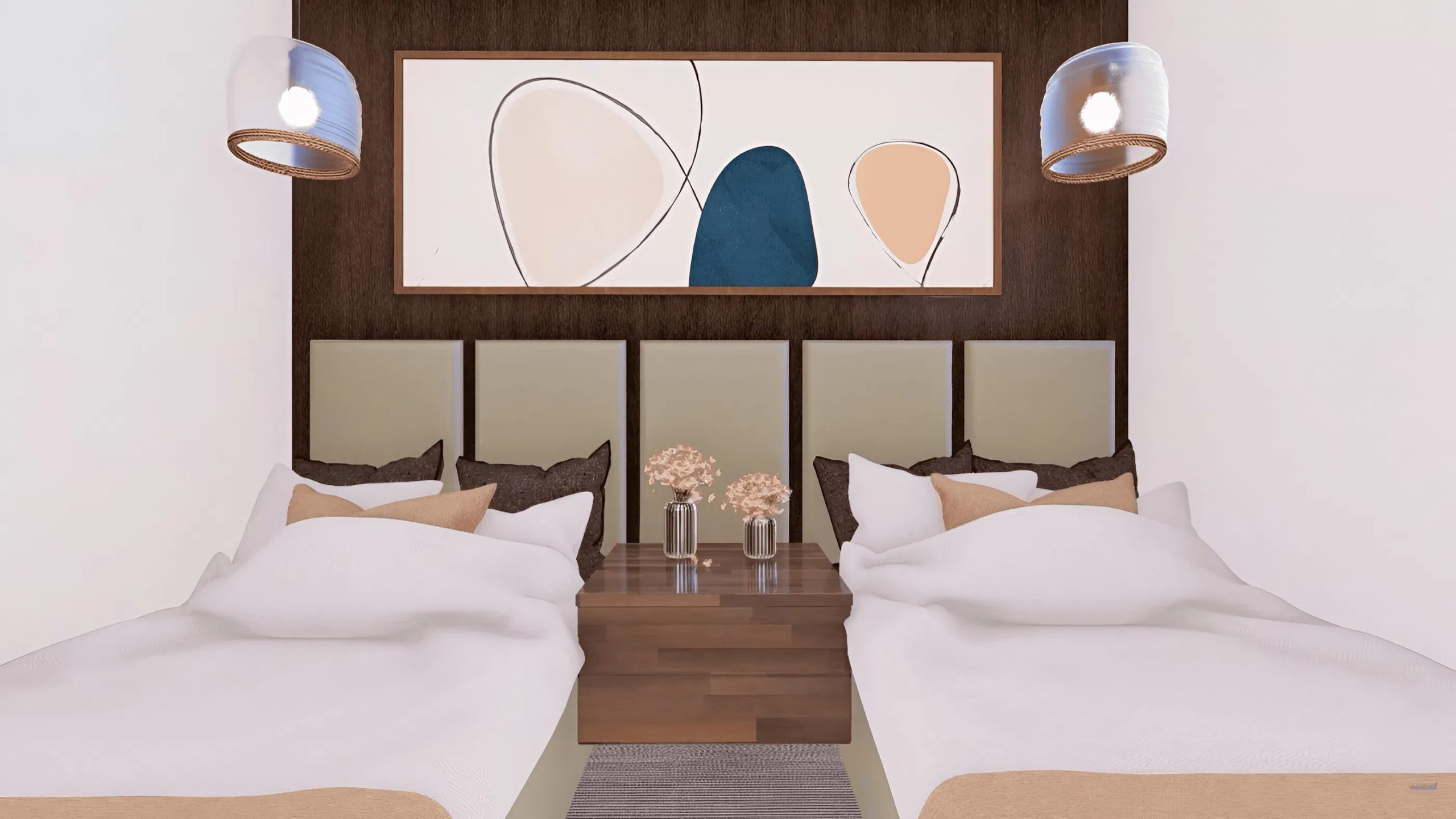 The second bed room accommodates two single beds, making it perfect for kids, friends, or multi-functional use. A shared lavatory outfitted with fashionable fixtures and facilities serves this bed room and customary areas. Each bedrooms embrace minimalist design rules with clear traces and impartial shade palettes that promote restful environments.