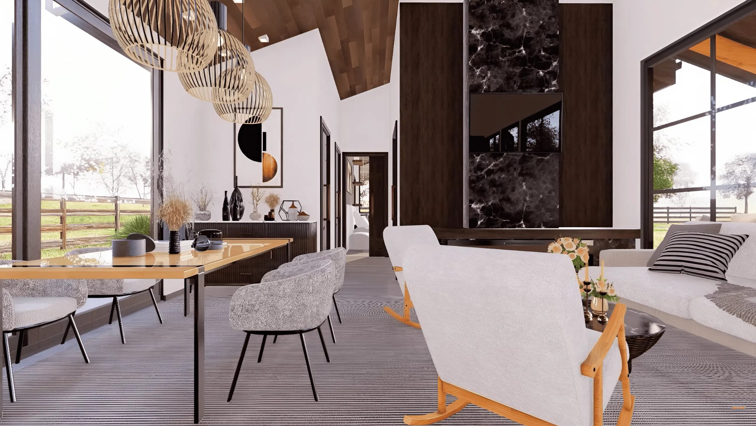 The kitchen encompasses a modern shade scheme combining espresso and black tones that ship an elegant, fashionable aesthetic. Smooth cabinetry and fashionable home equipment preserve the minimalist philosophy whereas offering full performance. A four-person eating desk positioned adjoining to the kitchen creates an intimate eating space excellent for household meals or entertaining small teams.