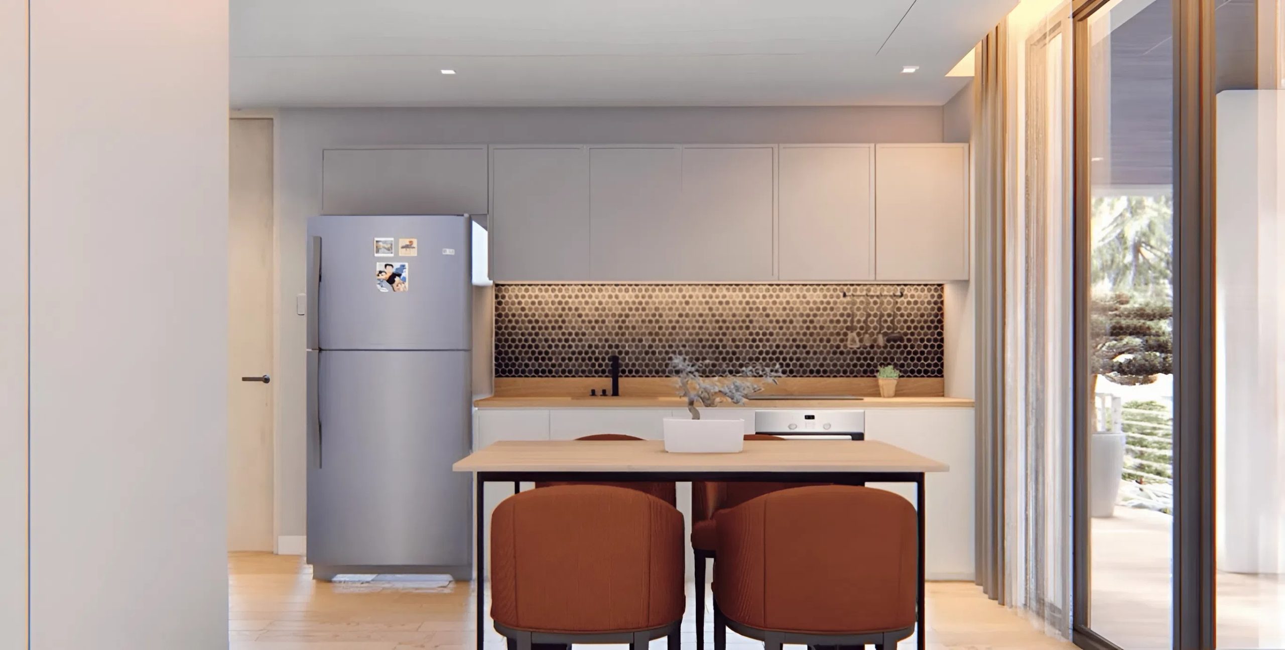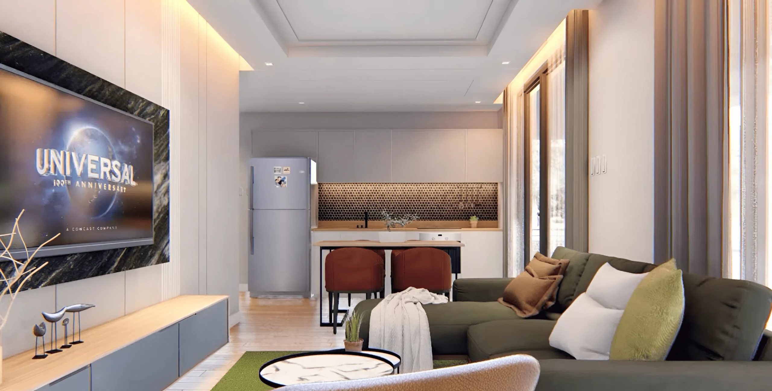 This snug sectional gives ample seating capability for members of the family and company with out overwhelming the room’s proportions. The modern, trendy kitchen options full-length counter tops operating alongside the wall, maximizing preparation and storage surfaces. Up to date cabinetry retains cookware and provides organized but simply accessible for day by day meal preparation. A four-person eating desk positioned immediately adjoining to the kitchen creates the proper transition between cooking and eating zones, facilitating straightforward meal service and household conversations.