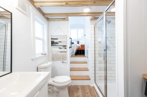 This elegant mannequin features a storage-rich kitchen, loft bed room, and compact lavatory — mixing fashionable design with sensible circulate.