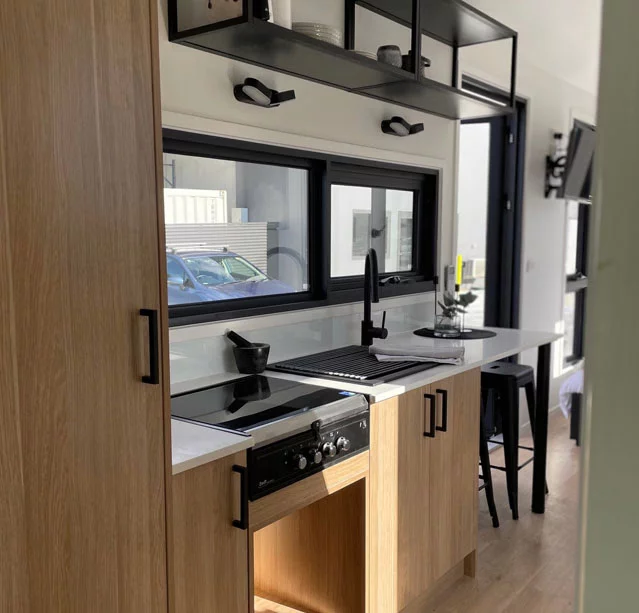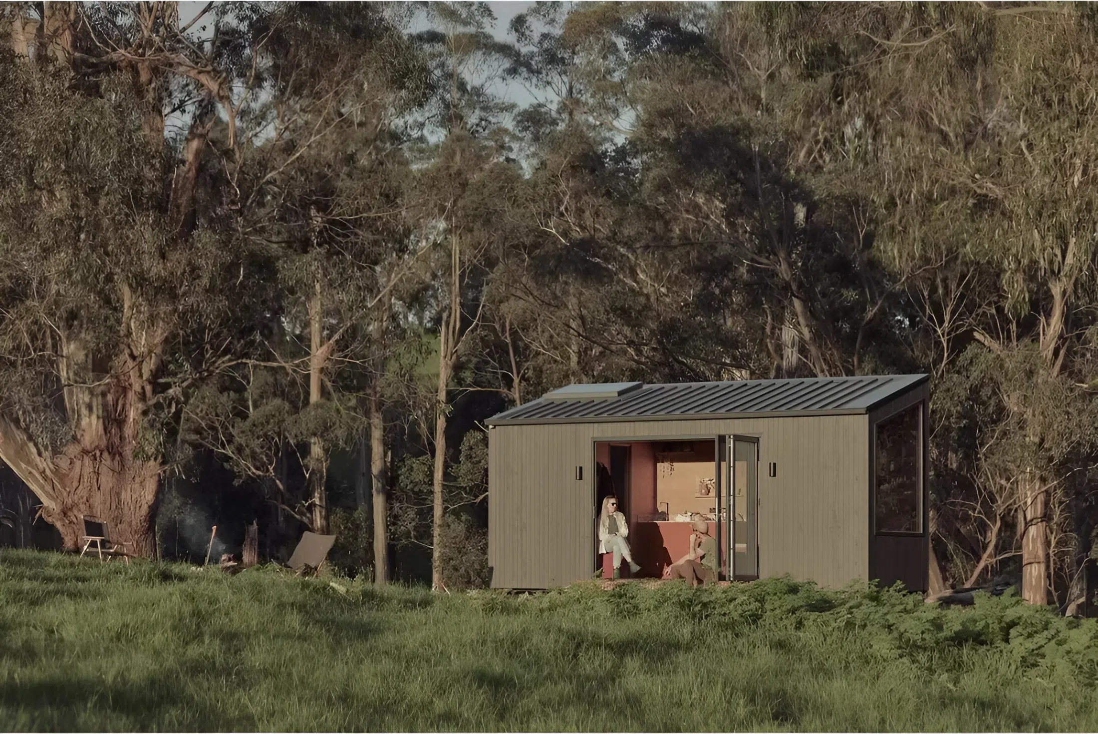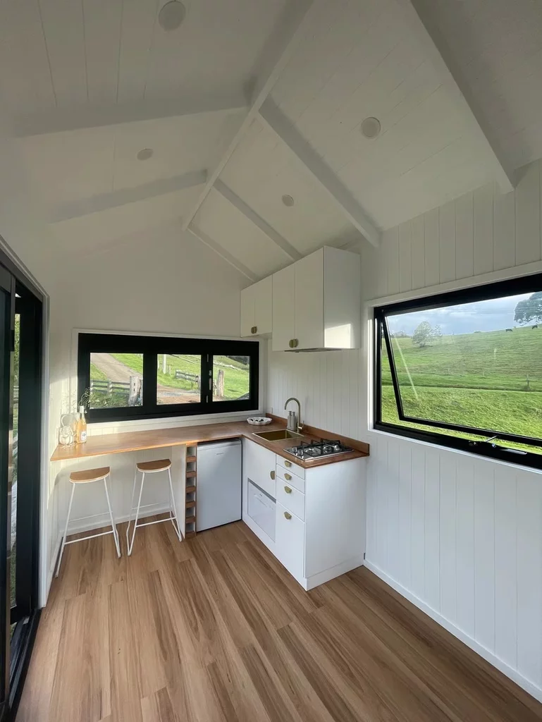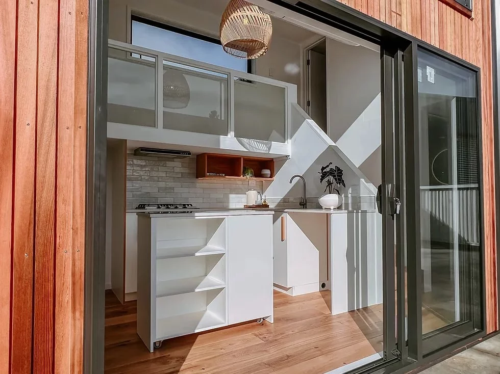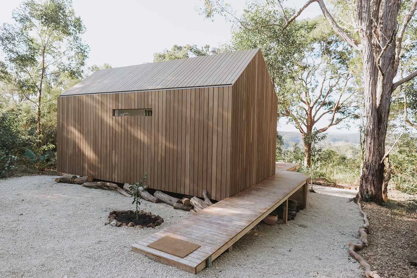 The Weekender is an off-grid 6.5m x 3.5m cabin providing 22.75 sqm of eco-friendly design, customized cabinetry, and fashionable fixtures for sustainable dwelling.