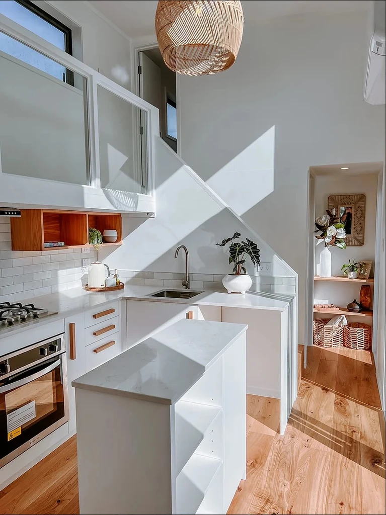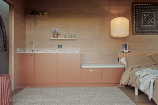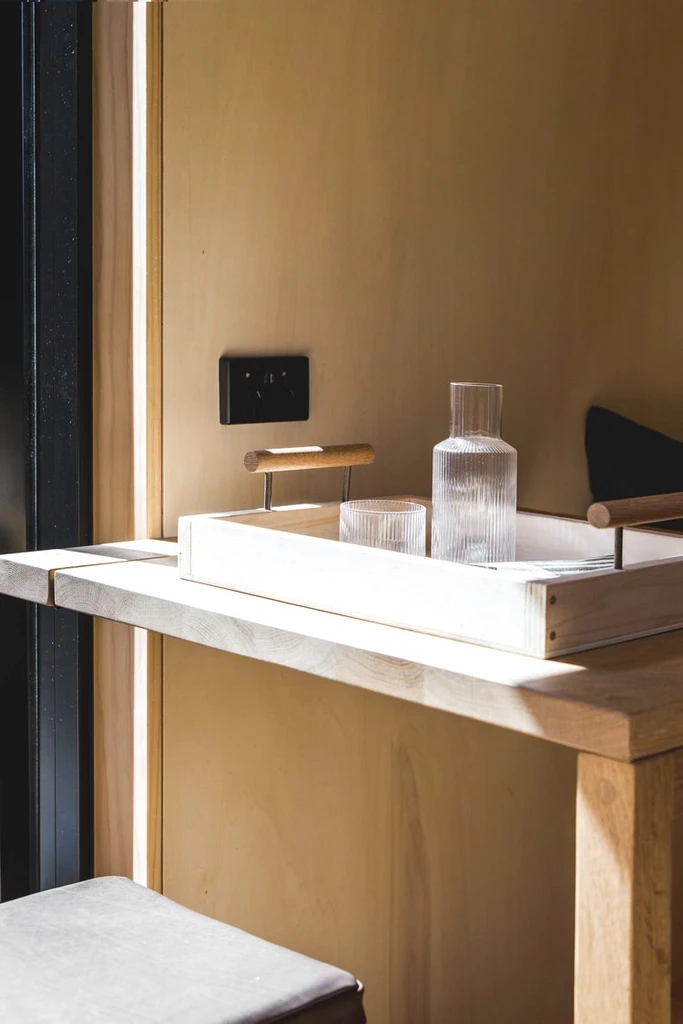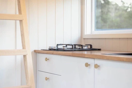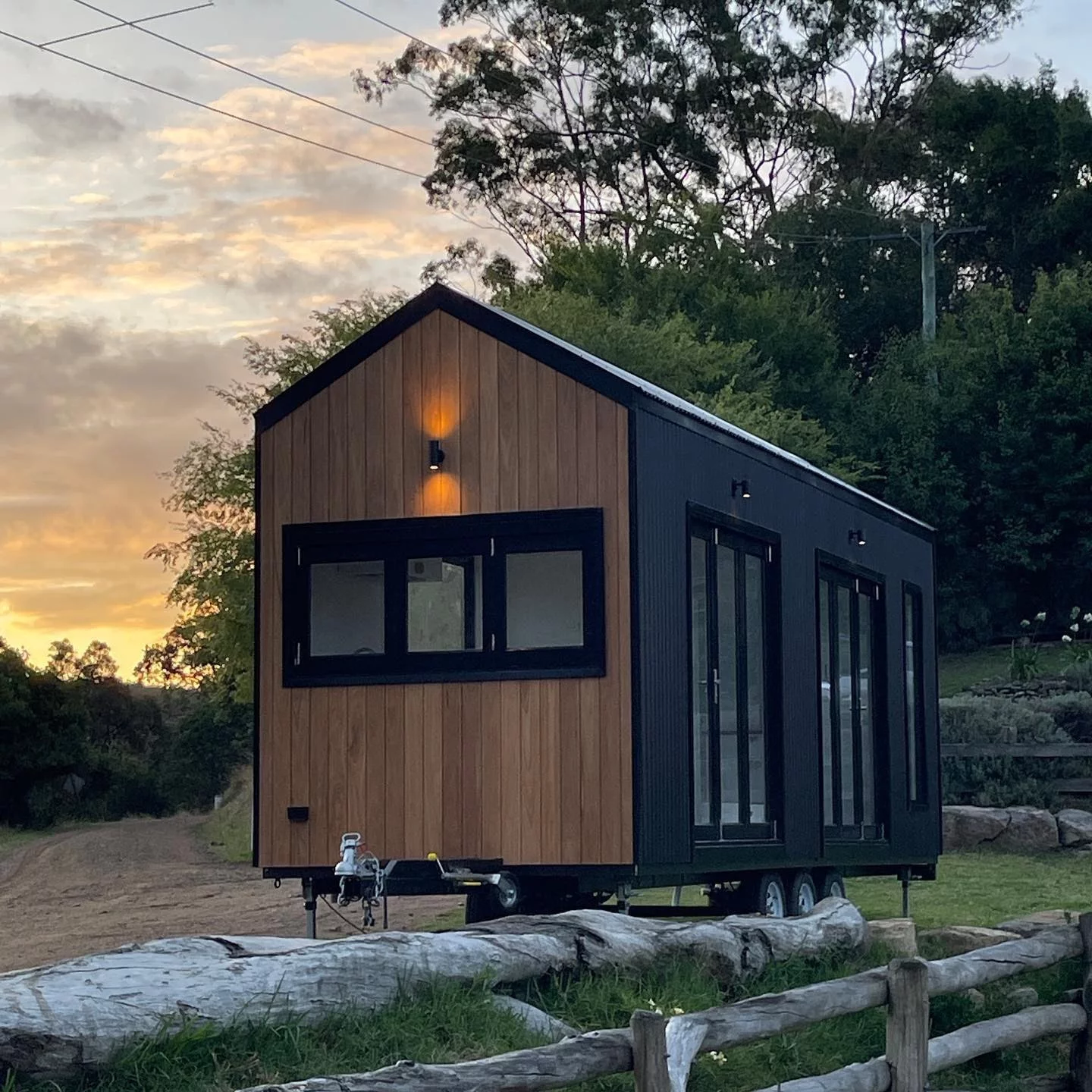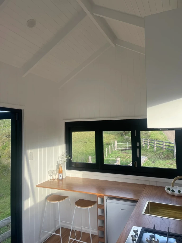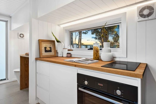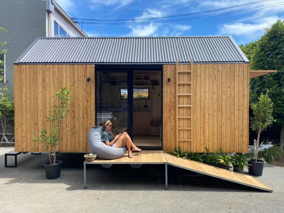 The Weekender is an off-grid 6.5m x 3.5m cabin providing 22.75 sqm of eco-friendly design, customized cabinetry, and fashionable fixtures for sustainable dwelling.