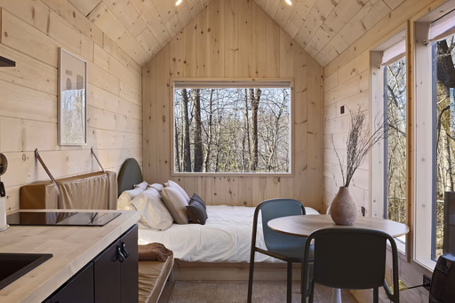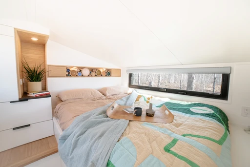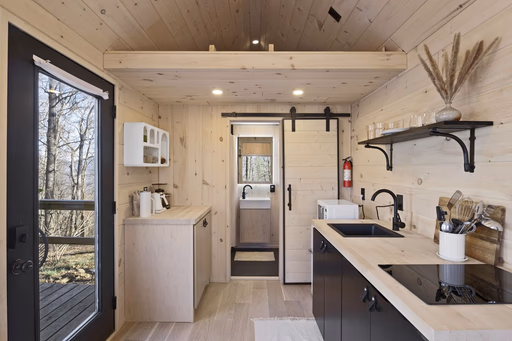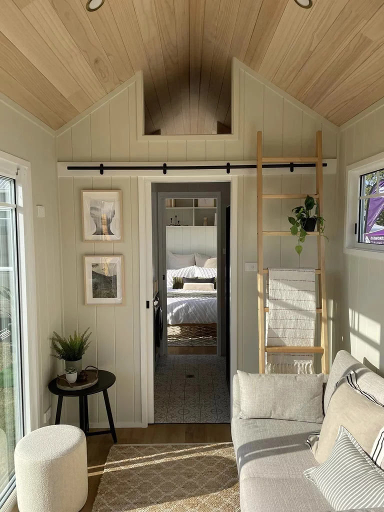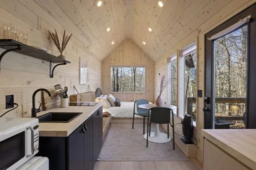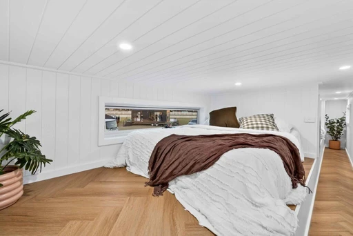 This 8’x24’ gable-shaped tiny house on wheels showcases a glossy cedar-and-metal exterior. Its Scandinavian-style inside features a ground-level mattress, storage loft, and vivid pure gentle — excellent for a trip rental or minimalist dwelling area.