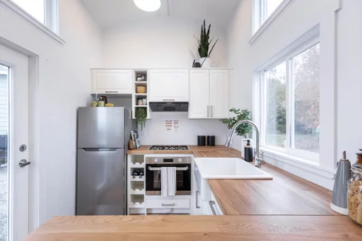 The Fern is a single-level design that includes an L-shaped kitchen, a full bed room, and a contemporary lavatory — perfect for single or couple dwelling.