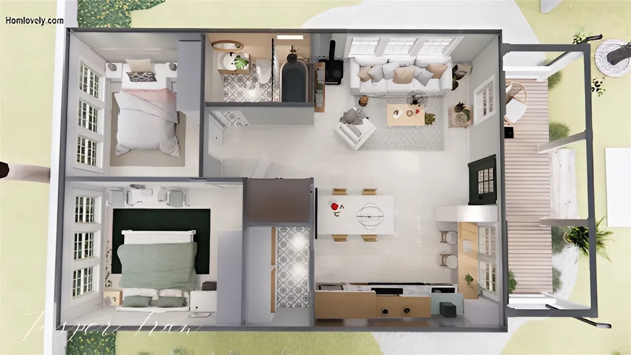 The attention-catching exterior combines crisp white partitions with wealthy darkish inexperienced accents for timeless attraction. A basic gable roof creates visible steadiness above the spacious entrance terrace. This mix ensures the home stands out with out feeling overwhelming in its compact footprint.
