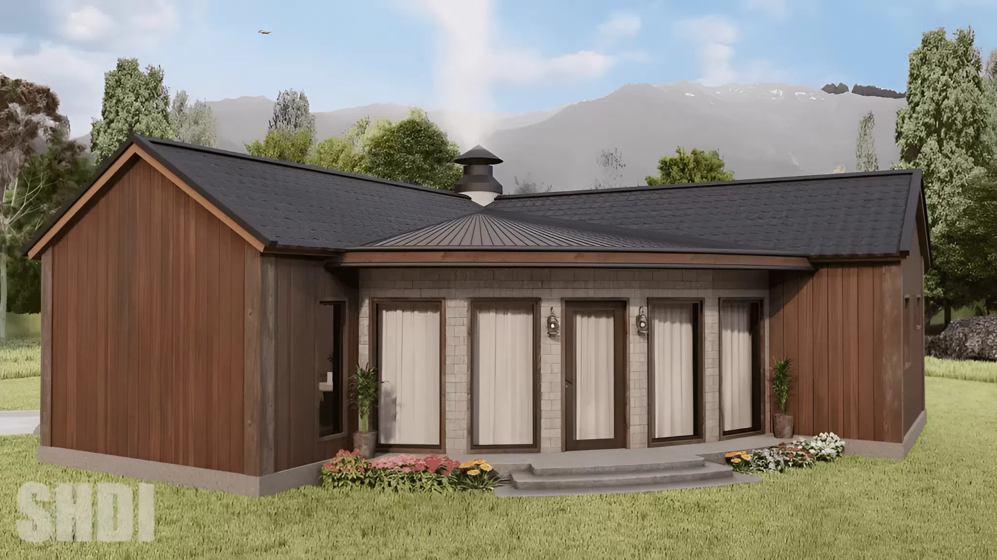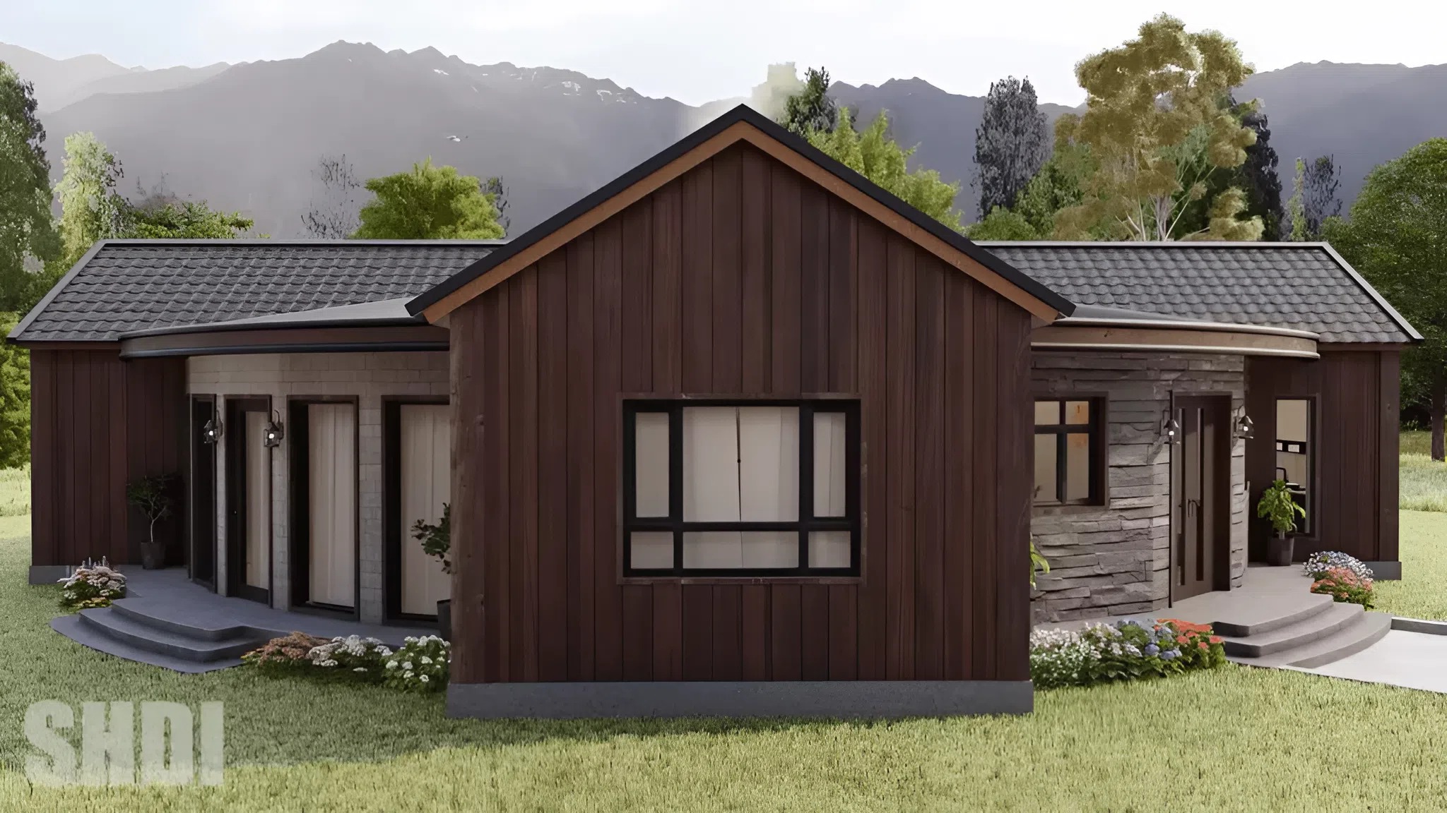 The attention-catching exterior options wealthy darkish wooden cladding with putting geometric architectural particulars. Fantastically positioned home windows add visible curiosity whereas maximizing daylight all through the inside. This exterior design invitations out of doors residing on patios and backyard areas.