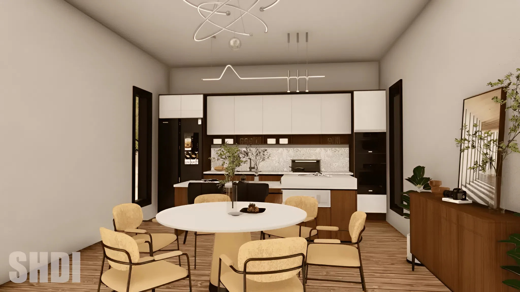 The kitchen impresses with beneficiant counter house and clever storage options for environment friendly each day use. A trendy spherical eating desk comfortably seats six, making it perfect for household meals or entertaining friends. Seamless move between cooking, eating, and residing areas enhances the social expertise.