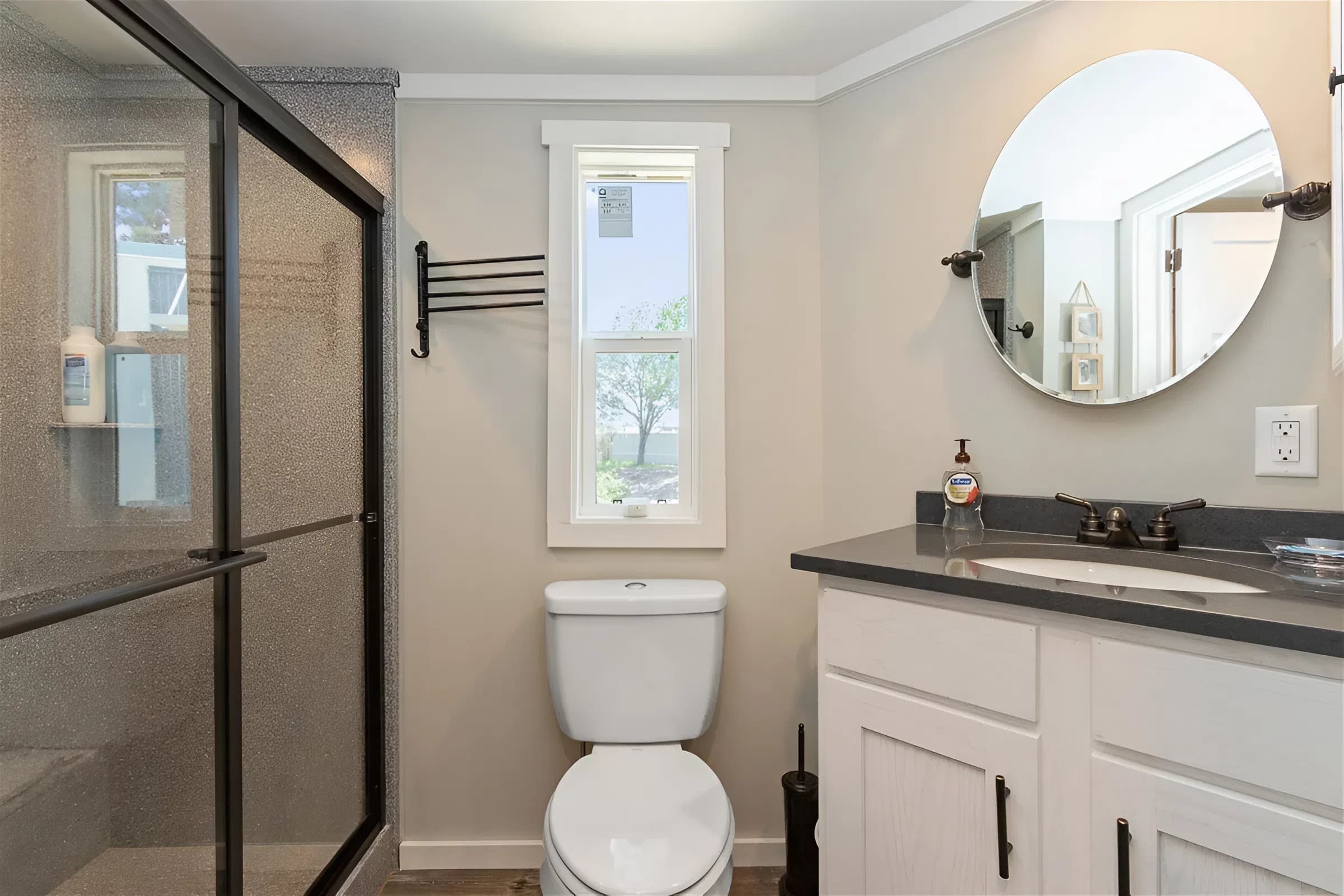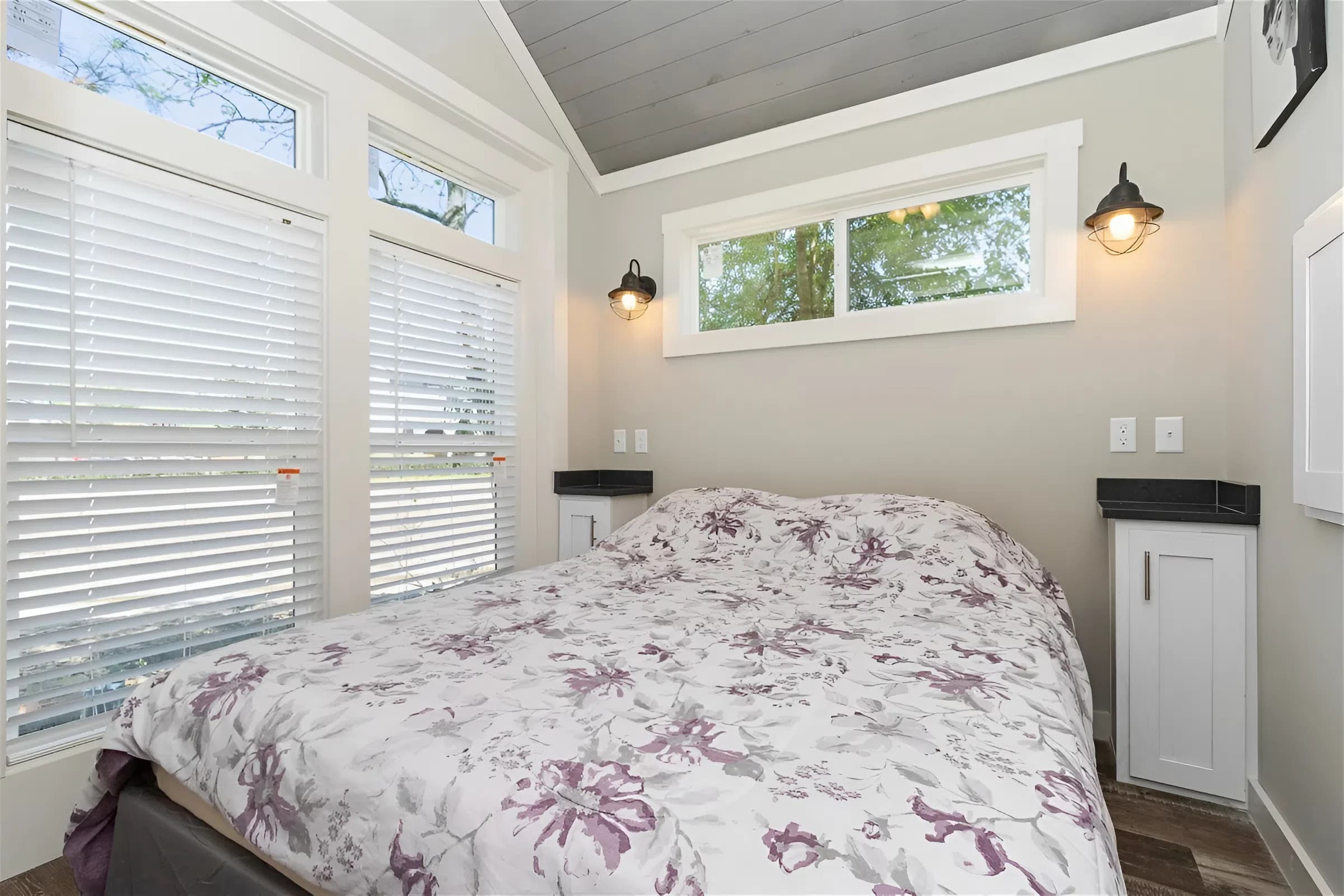 The adjoining half tub features a luxurious acrylic bathe, vessel sink, up to date self-importance, and residential-height rest room — far exceeding typical tiny dwelling requirements.