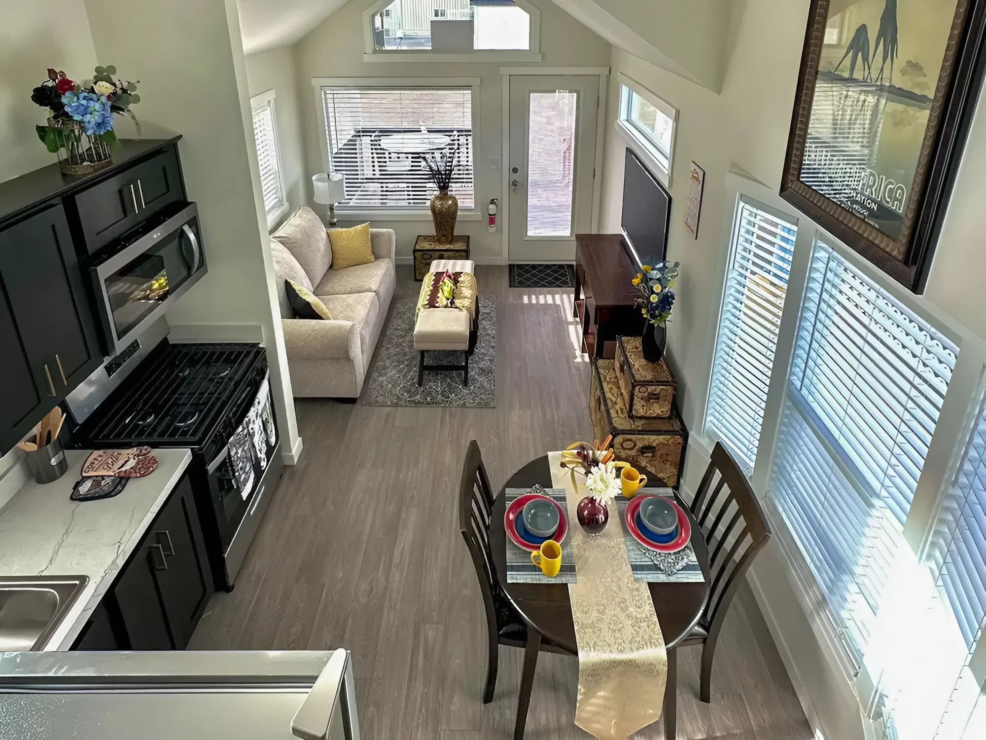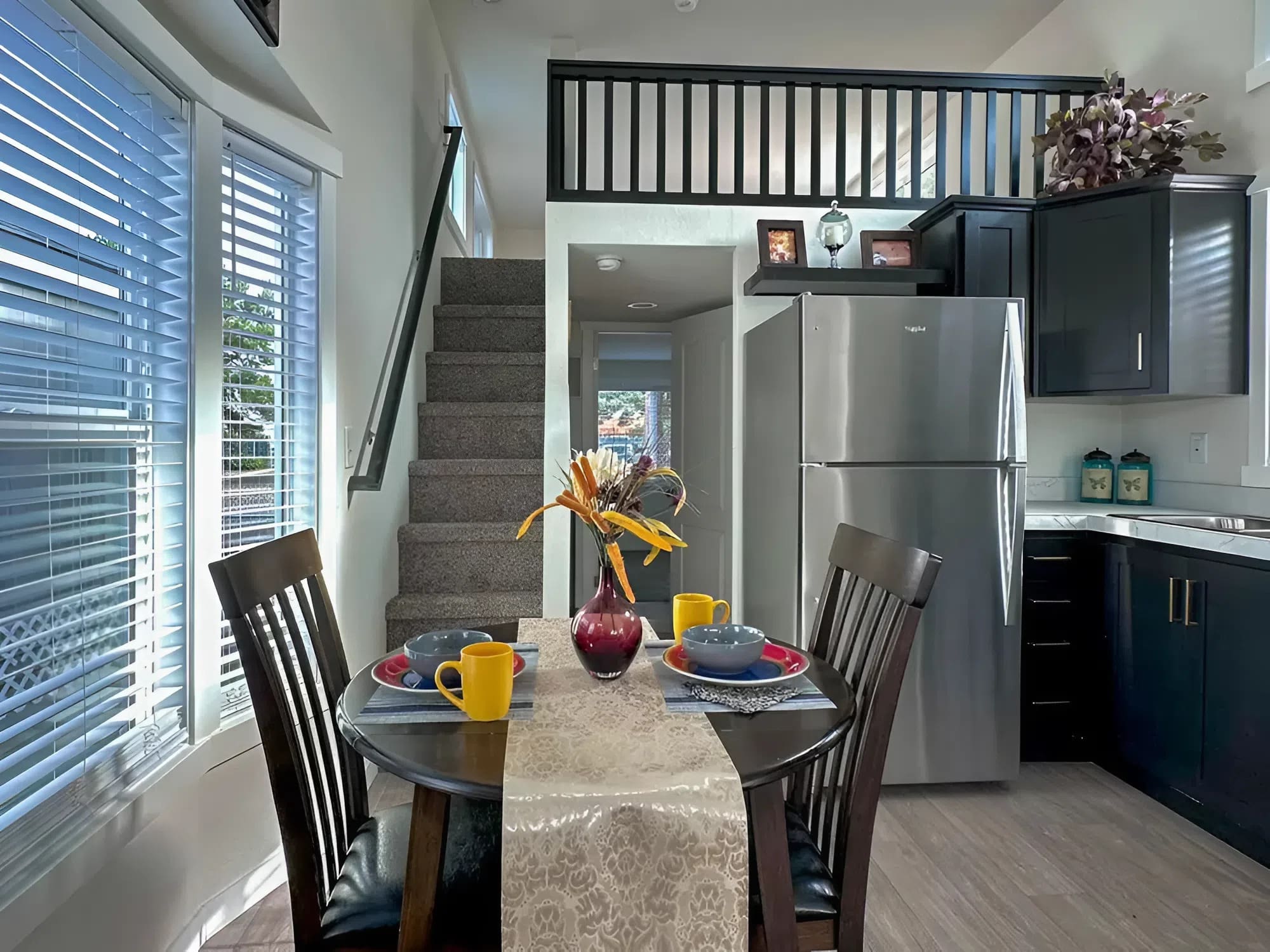 Beneficiant overhead loft accessible by way of built-in stairwell supplies versatile sleeping, storage, or passion area with out compromising predominant flooring residing areas.