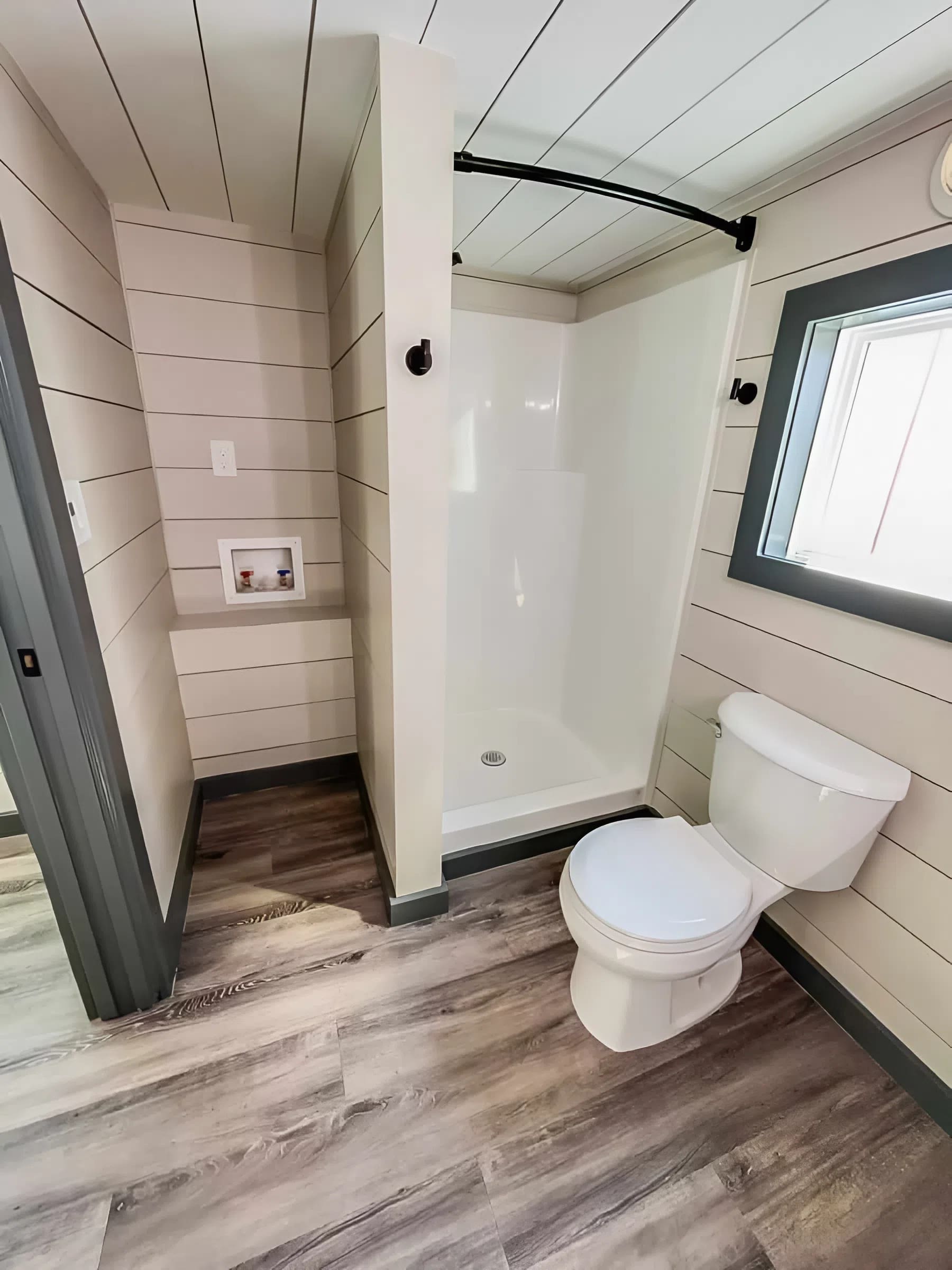 Customized cupboards and shelving assist maintain toiletries, towels, and cleansing provides organized, so the compact house nonetheless feels tidy and useful. The flooring is sturdy and water‑resistant, designed to deal with on a regular basis use with out carrying down.